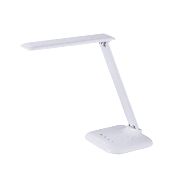 Λευκό πλαστικό επιτραπέζιο φωτιστικό αφής, τεχνολογίας LED με δυνατότητα εναλλαγής χρώματος φωτισμού (3000Κ – 4000Κ – 6000Κ). Λεπτός σχεδιασμός με κινητό βραχίονα, αντιολισθητική βάση και 3 βαθμίδες dimming.