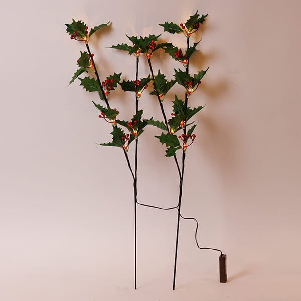 2 Φωτιζόμενα κλαδιά πράσινα με κόκκινα μούρα, μπαταρίας, 75 cm, 16 LED, χρονοδιακόπτης, Θερμό Λευκό (Warm white)