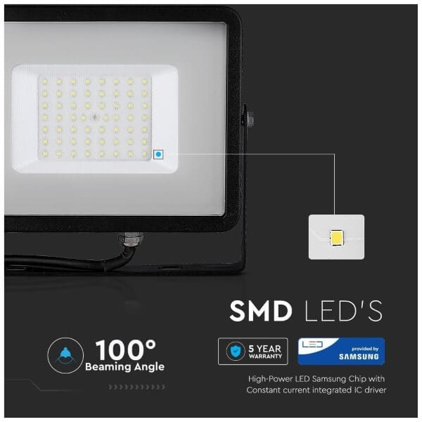 V-TAC μαύρος προβολέας, SMD LED, 50W, 6400Κ (Ψυχρό Λευκό), IP65